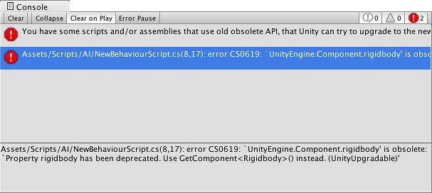 When the Console detects obsolete API calls, Unity shows a warning message about them. When you double-click this message, Unity automatically attempts to upgrade the deprecated usage to the recommended equivalent .