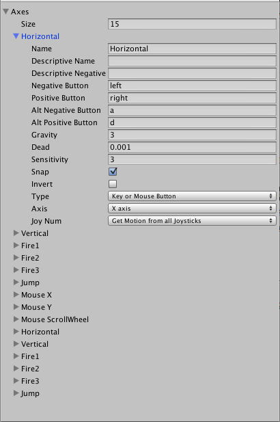 It is possible to create multiple axes with the same name. When getting the input axis, the axis with the largest absolute value will be returned. This makes it possible to assign more than one input device to one axis name. For example, create one axis for keyboard input and one axis for joystick input with the same name. If the user is using the joystick, input will come from the joystick, otherwise input will come from the keyboard. This way you don’t have to consider where the input comes from when writing scripts.