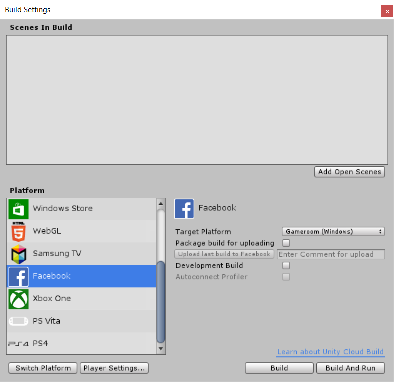 Here you can choose to build your content as WebGL or as a Windows Standalone for Gameroom. If you plan to upload your game, choose Package build for uploading, which generates a compressed package, which can be uploaded to facebook.