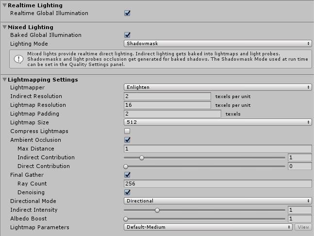 | Lightmap Parameters | Unity uses a set of general parameters for the lightmapping in addition to Lighting window properties of the. A few defaults are available from the menu for this property, but you can also use the Create New option to create your own lightmap parameter file. See the Lightmap Parameters page for further details. The default value is Default-Medium. |