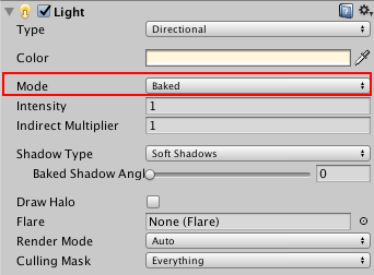 To control lighting precomputation and composition in Unity, you need to assign a Light Mode to a Light. This Light Mode defines the Light’s intended use. To assign a Light Mode, select the Light in your Scene and, in the Light Inspector window, select Mode.