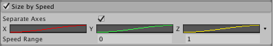You can specify how a particle’s width, height and depth size changes by speed independently. In the Size by Speed module, check the Separate Axes checkbox, then choose how the X (width), Y (height) and Z (depth) of the particle is affected by the speed of the particle. Remember that Z will only be used for MeshThe main graphics primitive of Unity. Meshes make up a large part of your 3D worlds. Unity supports triangulated or Quadrangulated polygon meshes. Nurbs, Nurms, Subdiv surfaces must be converted to polygons. More info