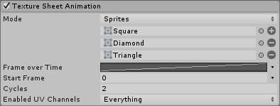 You can use the Single Row mode to create separate animation sequences for particles and switch between animations from a script. This can be useful for creating variation or switching to a different animation after a collisionA collision occurs when the physics engine detects that the colliders of two GameObjects make contact or overlap, when at least one has a Rigidbody component and is in motion. More info
