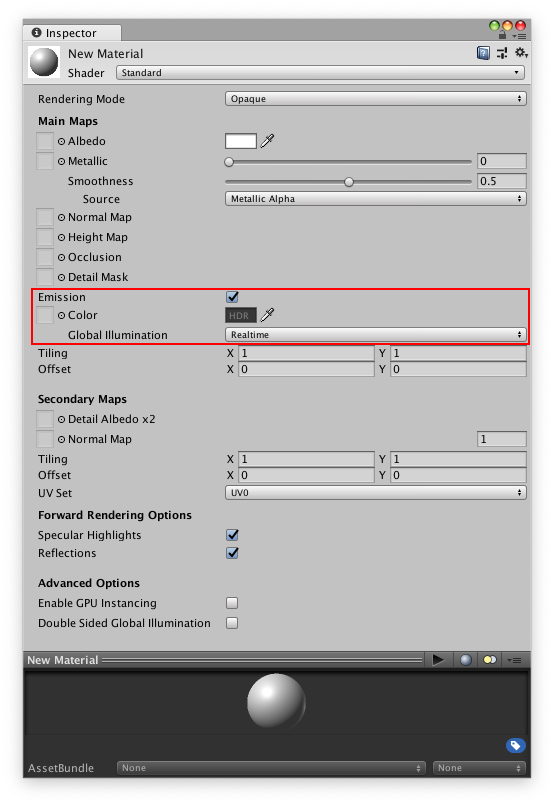 As well as the emission color and brightness, the Emission parameter has a Global Illumination setting, allowing you to specify how the apparent light emitted from this material affects the contextual lighting of other nearby GameObjects. There are two options