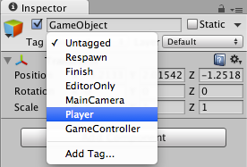 The Inspector shows the Tag and Layer drop-down menus just below any GameObject’s name. To apply an existing Tag to a GameObject, open the Tags dropdown and choose the Tag you want to apply. The GameObject is now associated with this Tag.