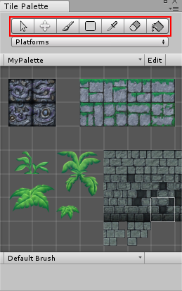 Tilemap painting tools are found in a row at the top of the Tile Palette window. These tools are also used to edit the Tile Palette itself.