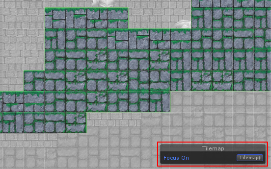 Use the Tilemap Focus mode to focus on a specific Tilemap or Grid GameObjectThe fundamental object in Unity scenes, which can represent characters, props, scenery, cameras, waypoints, and more. A GameObject’s functionality is defined by the Components attached to it. More info