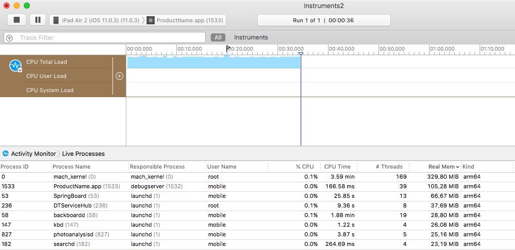 , etc. Your application memory usage can be tracked by two Xcode Instruments tools: Activity Monitor and Allocations. You can start from the Xcode Run menu: Product > Profile and then select specific tool or via Xcode > Open Developer Tools > Instruments. Activity Monitor tool shows all process statistics including Real memory which can be regarded as the total amount of RAM used by your application. Note: OS and device HW version combination might noticeably affect memory usage numbers, so you should be careful when comparing numbers obtained on different devices.