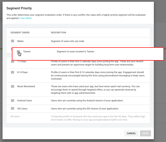 When a player is a member of more than one segment, Unity sends the value assigned for highest priority segment. (If a setting doesn’t have any segmented values, or the player isn’t a member of the segments that do have different values for a key, then Unity sends the All Users value.) You can set the order of your segments to specify which segmented values should take precedence when there is an overlap.