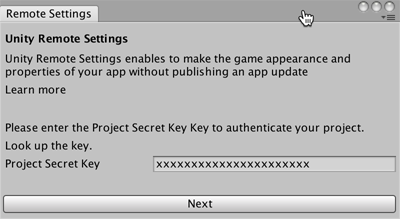 project and click Next. You can find your Project Secret Key under the Configure page on the Unity Analytics dashboard