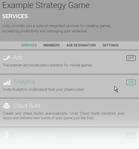 and then click the OFF button to toggle it ON. If you haven’t already done so, at this stage you will need to complete the mandatory Age Designation field for your project. (Again, you may have already done this for a different Unity Service, such as Ads). This age designation selection will appear in the Services window.