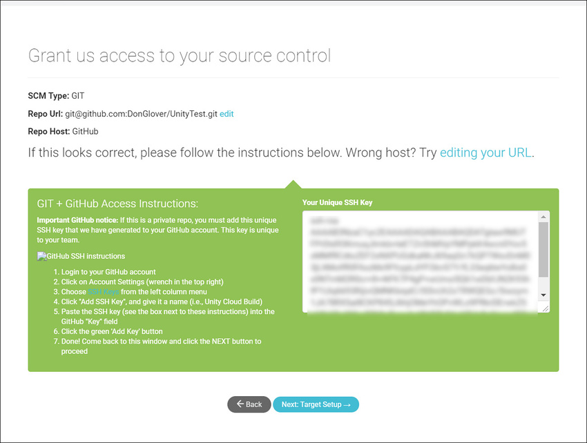 When Unity Cloud Build connects to the hosting site, it automatically detects whether your repository is public or private. If your repository is public, Cloud Build automatically connects to it and you can skip to Setting up a target build platform.
