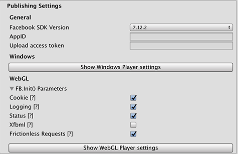 | Show WebGL Player Settings | Click this button to switch to the WebGL Player settings, which affect any Facebook builds for WebGL. |