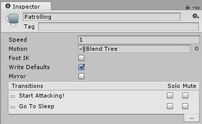 If either the current or next state belonging to this transition is a Blend Tree state, the Blend Tree parameters appear in the Inspector. Adjust these values to preview how your transition would look with the Blend Tree values set to different configurations. If your Blend Tree contains clips of differing lengths, you should test what your transition looks like when showing both the short clip and the long clip. Adjusting these values does not affect how the transition behaves at runtime; they are solely for helping you preview how the transition could look in different situations.