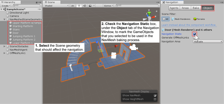 Building a NavMesh for your sceneA Scene contains the environments and menus of your game. Think of each unique Scene file as a unique level. In each Scene, you place your environments, obstacles, and decorations, essentially designing and building your game in pieces. More info
