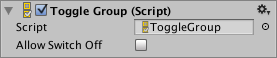 Note that the Toggle Group will not enforce its constraint right away if multiple toggles in the group are switched on when the scene is loaded or when the group is instantiated. Only when a new toggle is swicthed on are the others switched off. This means it’s up to you to ensure that only one toggle is switched on from the beginning.