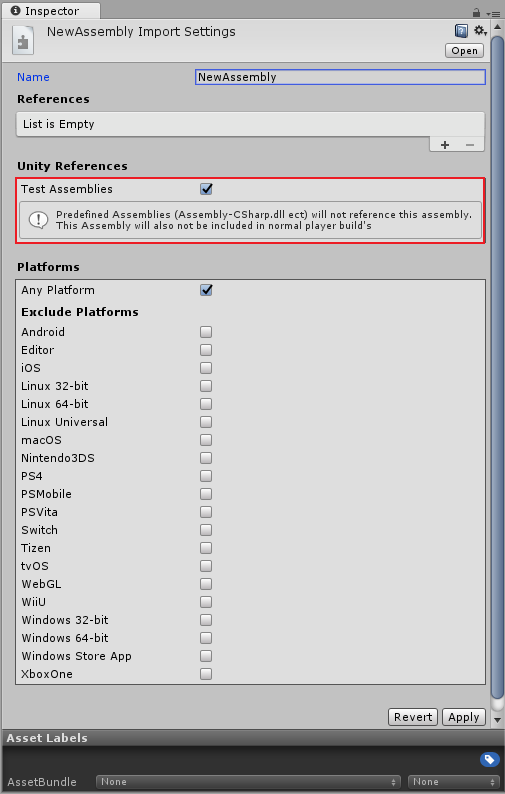 Note: Enabling PlayMode tests for all assemblies includes additional assemblies in your Project’s build, which can increase your Project’s size as well as build time.