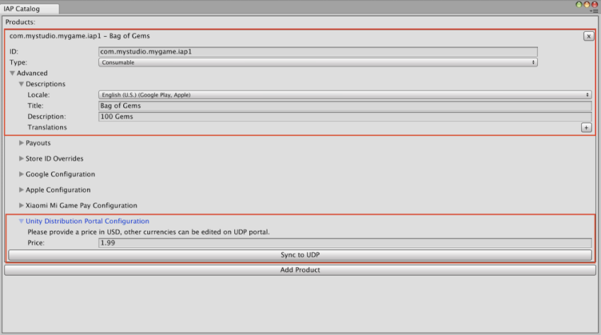 3. To save your IAP product to the UDP console, select Sync to UDP. Do this for each IAP product you create.