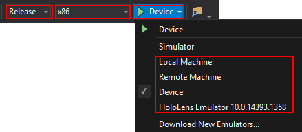 2. In the main Visual Studio taskbar (left to right in image below), change the target platform for your solution, and select which device to run the solution on.