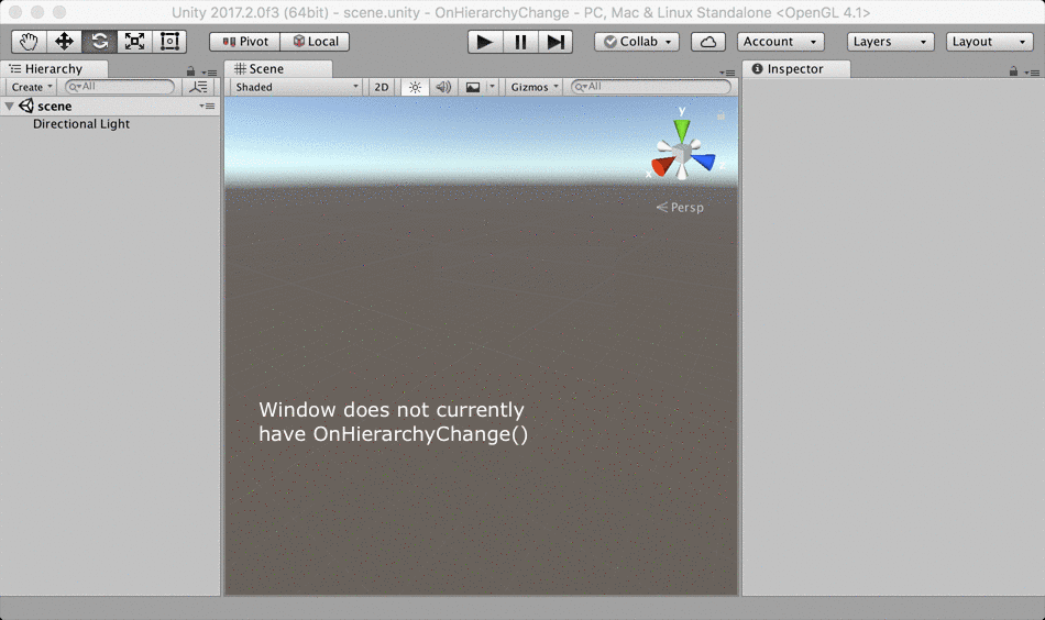 The OnHierarchyChange() is added to the Unity editor. Once installed objects are watches in the Scene and inspector. Adding a new GameObject into the Scene, or changing the position of a GameObject in the Inspector will be observed by OnHierarchyChange(). Similarly changes to the rotation and scale will be seen.