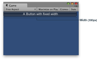 public class ExampleScript : MonoBehaviour { // Draws a button with a fixed width void OnGUI() { GUILayout.Button("A Button with fixed width", GUILayout.Width(300)); } }