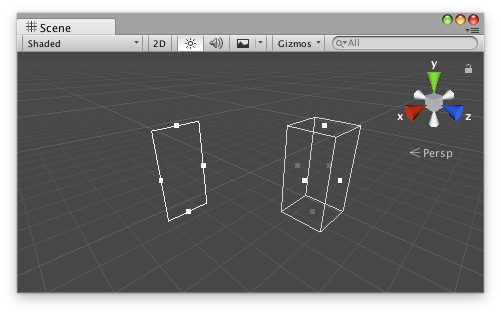 A compound handle to edit a box-shaped bounding volume in the Scene view.