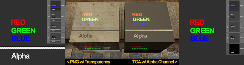 When creating textures, it’s important not to mix up the alpha channel. The example below shows how transparency in a PNG file can be confusing to author in Photoshop because of the way Photoshop deals with a PNG alpha channel (without using an external plugin). In this case, an uncompressed 32-bit TGA with a dedicated alpha channel might be a better option, assuming the source texture file size is not an issue: