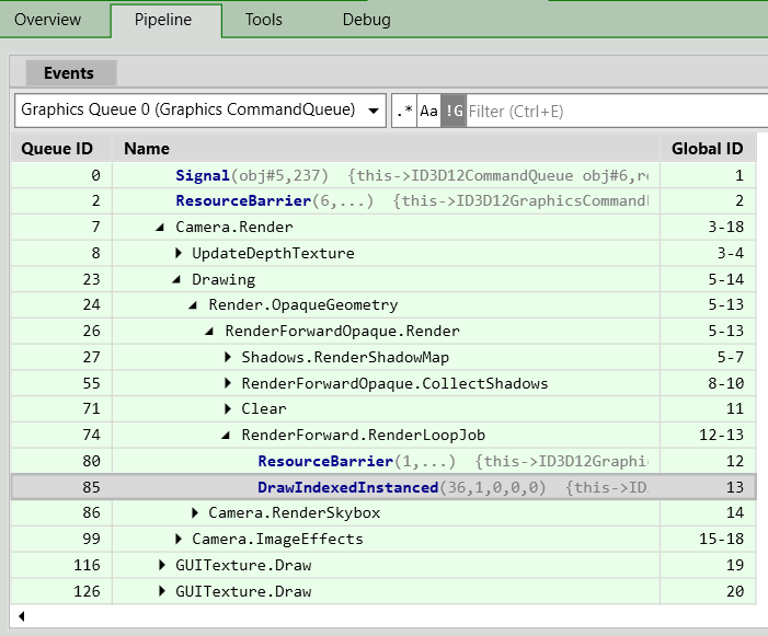 10. Select the Pipeline tab and use the__ Events__ window to navigate to a draw call you are interested in.