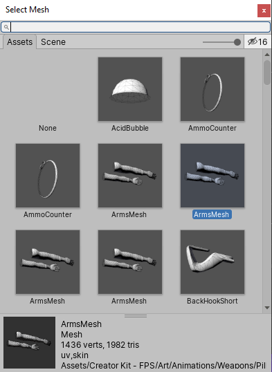 The object picker lets you search for and select objects within the sceneA Scene contains the environments and menus of your game. Think of each unique Scene file as a unique level. In each Scene, you place your environments, obstacles, and decorations, essentially designing and building your game in pieces. More info