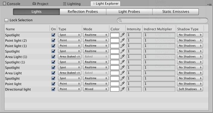 The Light Explorer window allows you to select and edit light sources. To open the Light Explorer window from the menu, navigate to Window > RenderingThe process of drawing graphics to the screen (or to a render texture). By default, the main camera in Unity renders its view to the screen. More info