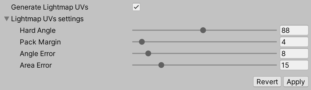 Assets folder (Project tab) More infoThese are the settings that appear in the Model tab of the Model Import Settings, when you enable Generate Lightmap UVs.