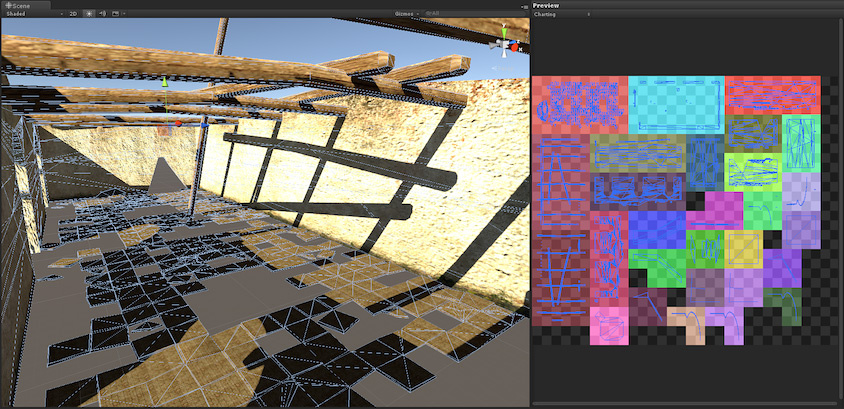 This process cannot alter the number of vertices in the model, so it cannot introduce breaks in the UVs where there already one present. This means the resulting chart layout is the same, but some of the charts might overlap or be merged in areas where it is unlikely to have a negative effect on the indirect lighting.
