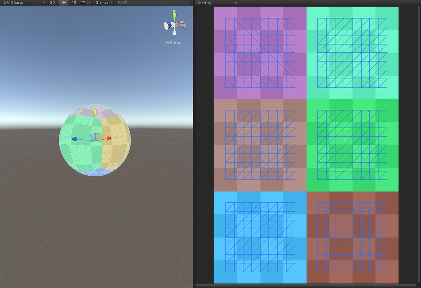 See in Glossary, it is very important to understand how UV charts are detected. By default, a chart is defined by a set of connected vertices. However, the DCC or Unity MeshThe main graphics primitive of Unity. Meshes make up a large part of your 3D worlds. Unity supports triangulated or Quadrangulated polygon meshes. Nurbs, Nurms, Subdiv surfaces must be converted to polygons. More info