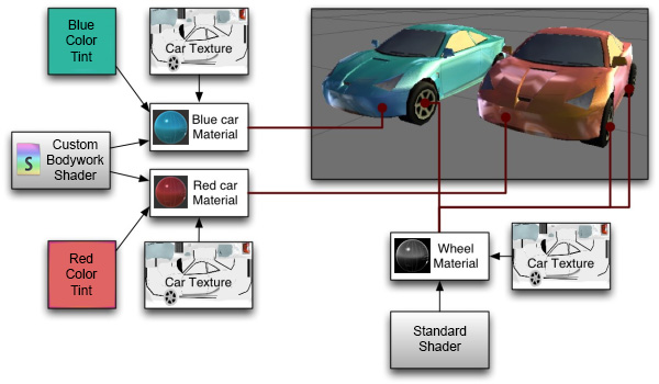 In the diagram we have a red car and a blue car. Both models use a separate material for the bodywork, “Red car material” and “Blue car material” respectively.