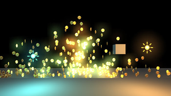 YES: The coins are a particle systemA component that simulates fluid entities such as liquids, clouds and flames by generating and animating large numbers of small 2D images in the scene. More info See in Glossary with an animated texture, one script does the collisionA collision occurs when the physics engine detects that the colliders of two GameObjects make contact or overlap, when at least one has a rigidbody component and is in motion. More info See in Glossary testing for all the coins and sets their color according to distance from a light.