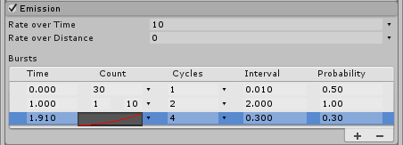 | Bursts | A burst is an event which spawns particles. These settings allow particles to be emitted at specified times. |