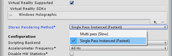 See in Glossary, then select the Player category). Then navigate to the Other Settings panel, enable the Virtual Reality Supported property, then select Single Pass Instanced (Fastest) from the Stereo Rendering Method dropdown menu.