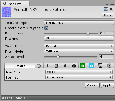 A normal map can be imported by placing the texture file in your assets folder, as usual. However, you need to tell Unity that this texture is a normal map. You can do this by changing the “Texture Type” setting to “Normal Map” in the import inspectorA Unity window that displays information about the currently selected GameObject, Asset or Project Settings, alowing you to inspect and edit the values. More info
