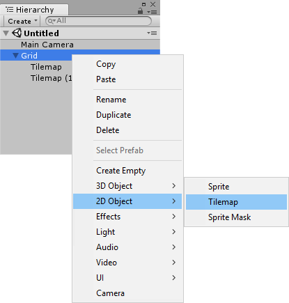 Create additional Tilemaps by selecting the Grid GameObject or the Tilemap GameObject, and then go to the menu: GameObjectThe fundamental object in Unity scenes, which can represent characters, props, scenery, cameras, waypoints, and more. A GameObject’s functionality is defined by the Components attached to it. More info