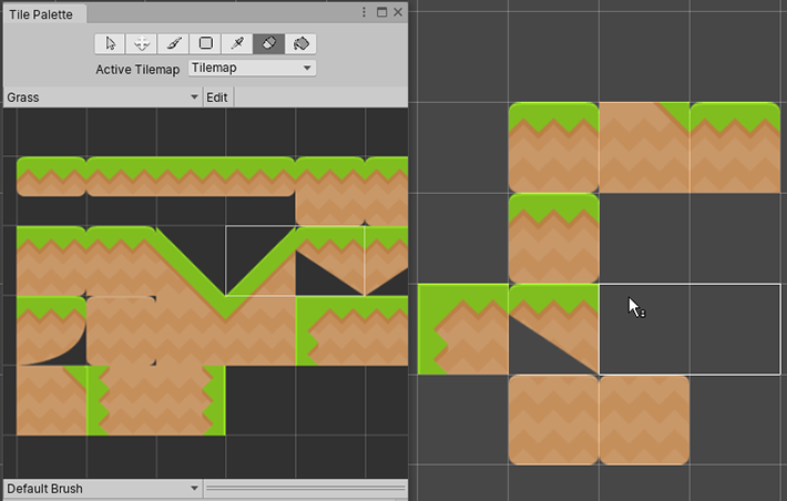 Use the Erase Tool to erase Tiles from the Tilemap by selecting them while the tool is enabled. To erase a larger area at once, hold and drag the Erase Tool to the desired size in the Tilemap Palette, then paint over Tiles you want to delete on the Tilemap.