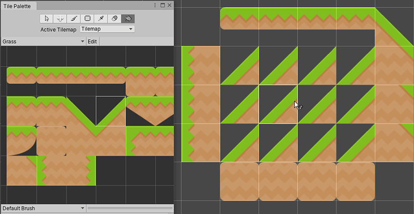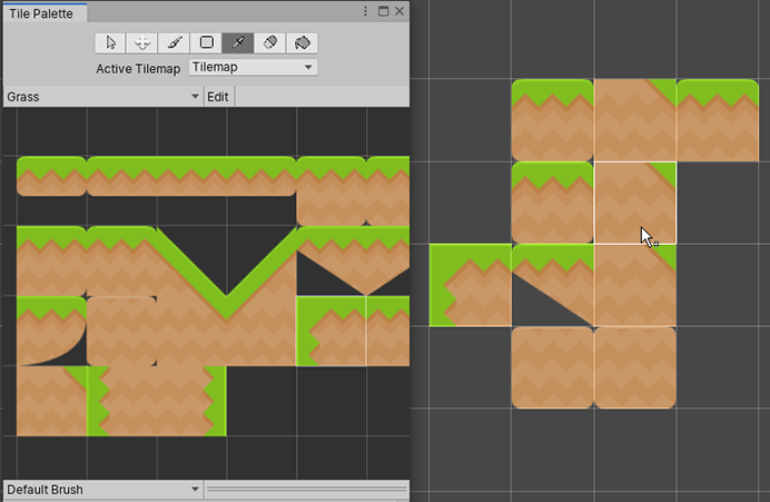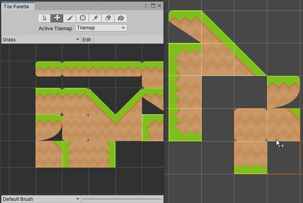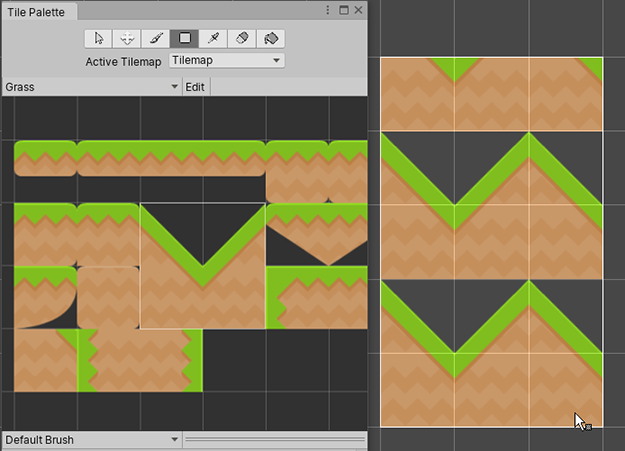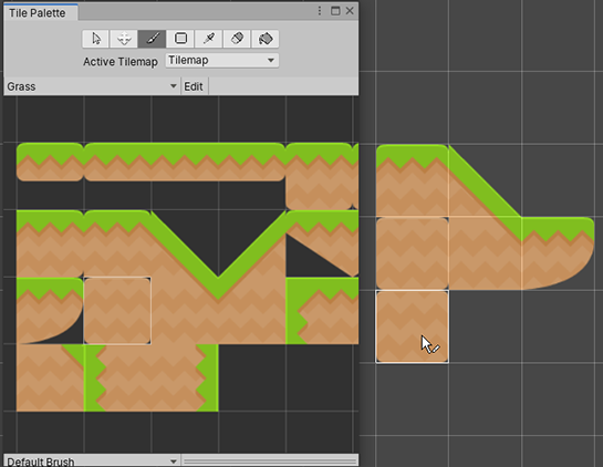 Use the Paintbrush Tool to select a Tile in the Tilemap Palette, or hold and drag over multiple Tiles to select more at once. Then click on any location on the Tilemap in the Scene to begin painting with your selected Tiles. Hold Shift while using the Paintbrush Tool to switch to the Erase Tool.