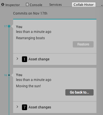 To open the Collab History window, on the Unity Editor menu bar, select Window > Asset Management > Collab History.