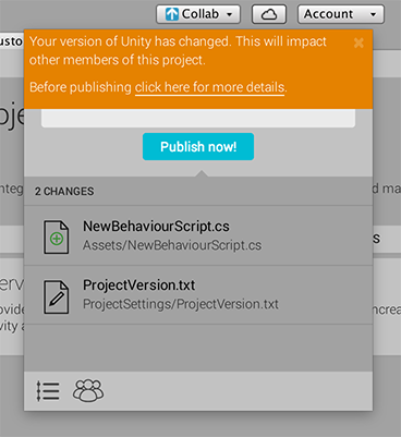 Unity Collaborate verifies that the version of Unity used for the update that you are publishing matches the version of Unity used to published the latest update shown in the Collab History window. If the version does not match, Unity displays the following warning: