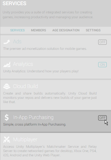 Once you have set up your project for Unity Services, you can enable the Unity IAPAbbreviation of Unity In App Purchase