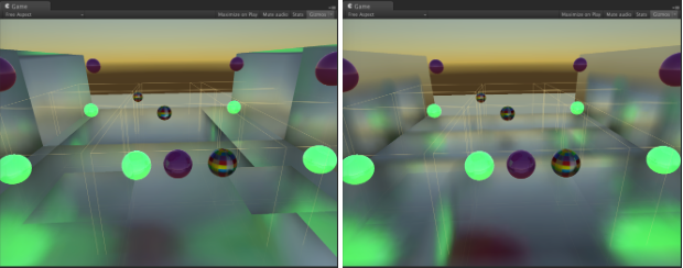 Comparison of current behavior (reflection probes per object; in some cases hard to avoid harsh reflection transitions between large objects) and reflection probes per pixelThe smallest unit in a computer image. Pixel size depends on your screen resolution. Pixel lighting is calculated at every screen pixel. More info