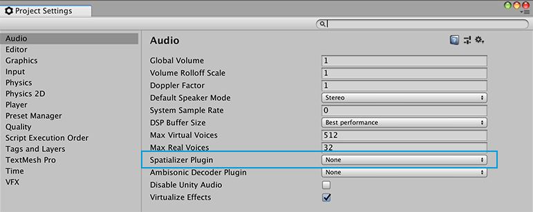 Enable these plugins through the Audio settings (menu: Edit > Project Settings, then select the Audio category) using the Spatializer Plugin dropdown menu. The native plugins can be used with or without VR mode enabled.