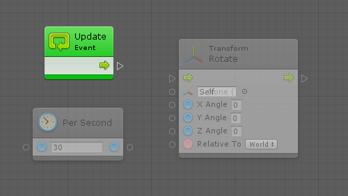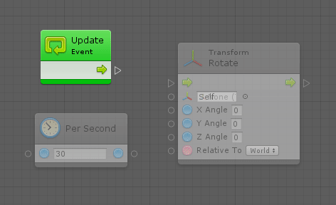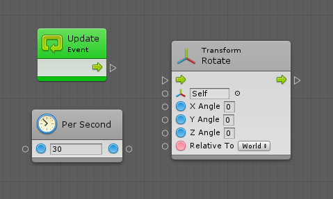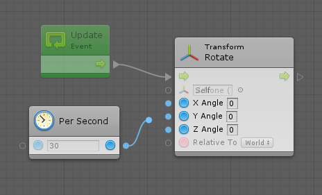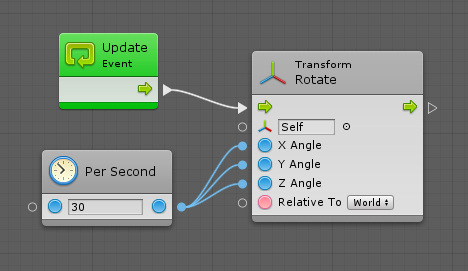 This graph reads as “at every frame, rotate your own transform in the Y axis at a rate of 30 degrees per second”.