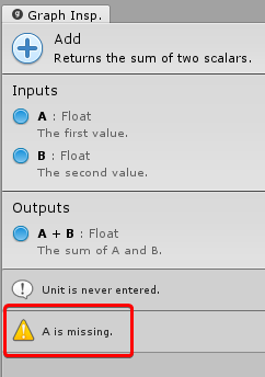 When that happens, you can use the warnings shown in the graph inspectorA Unity window that displays information about the currently selected GameObject, Asset or Project Settings, alowing you to inspect and edit the values. More info