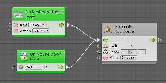 You can also connect multiple control output ports to a single control input port. For example, here, a jump force would be applied either when the player presses space or clicks on the object: