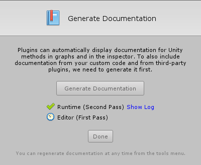 During the setup wizard, you will be prompted to generate this documentation. However, if you make a change in your scripts, you’ll need to update it. To do so, open Tools > Ludiq > Generate Documentation… and click Generate Documentation.